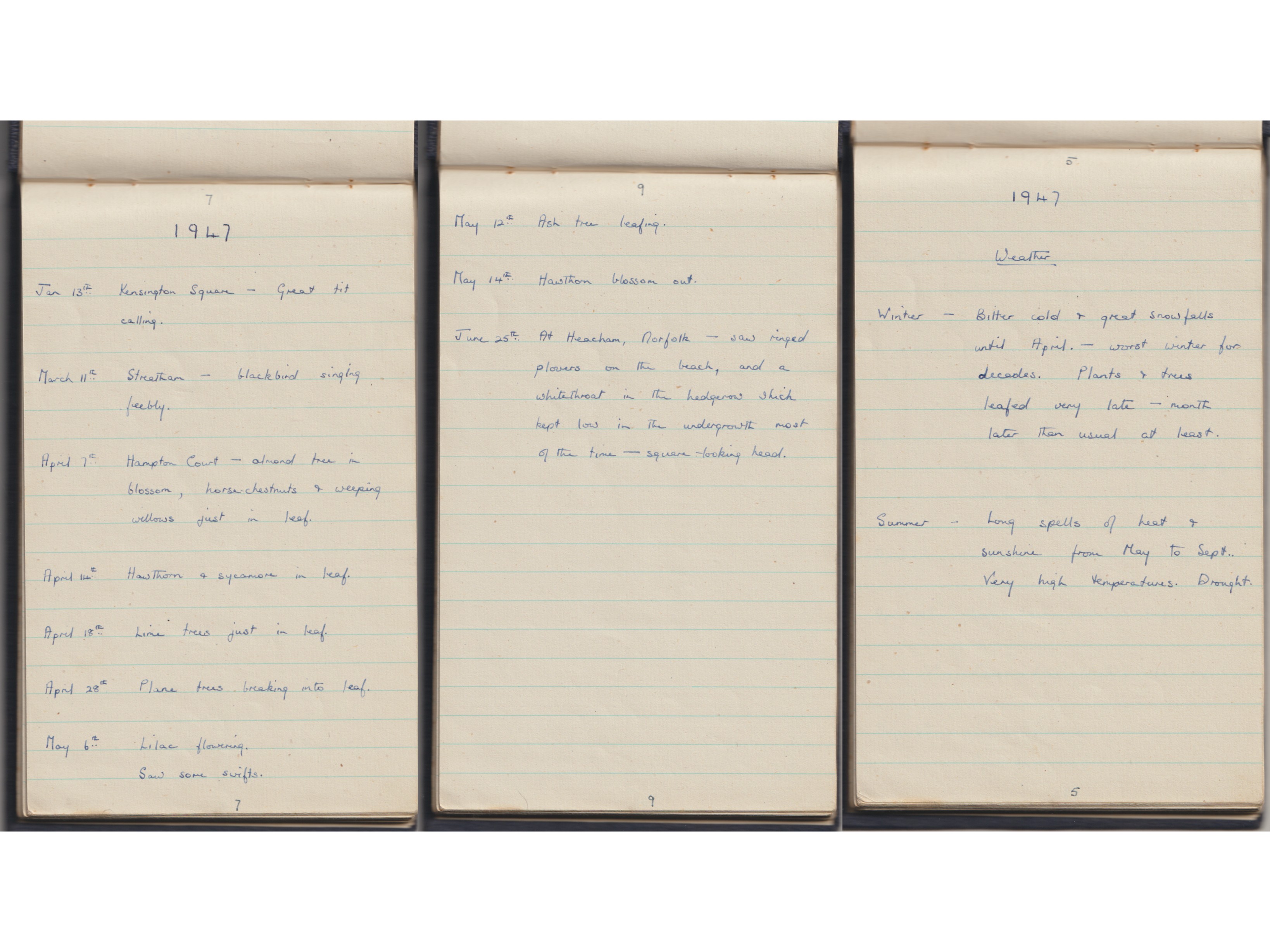 Here is a copy of Jean’s phenology diary, dated 1947, the year she began her records. Image courtesy of Gill Combes.