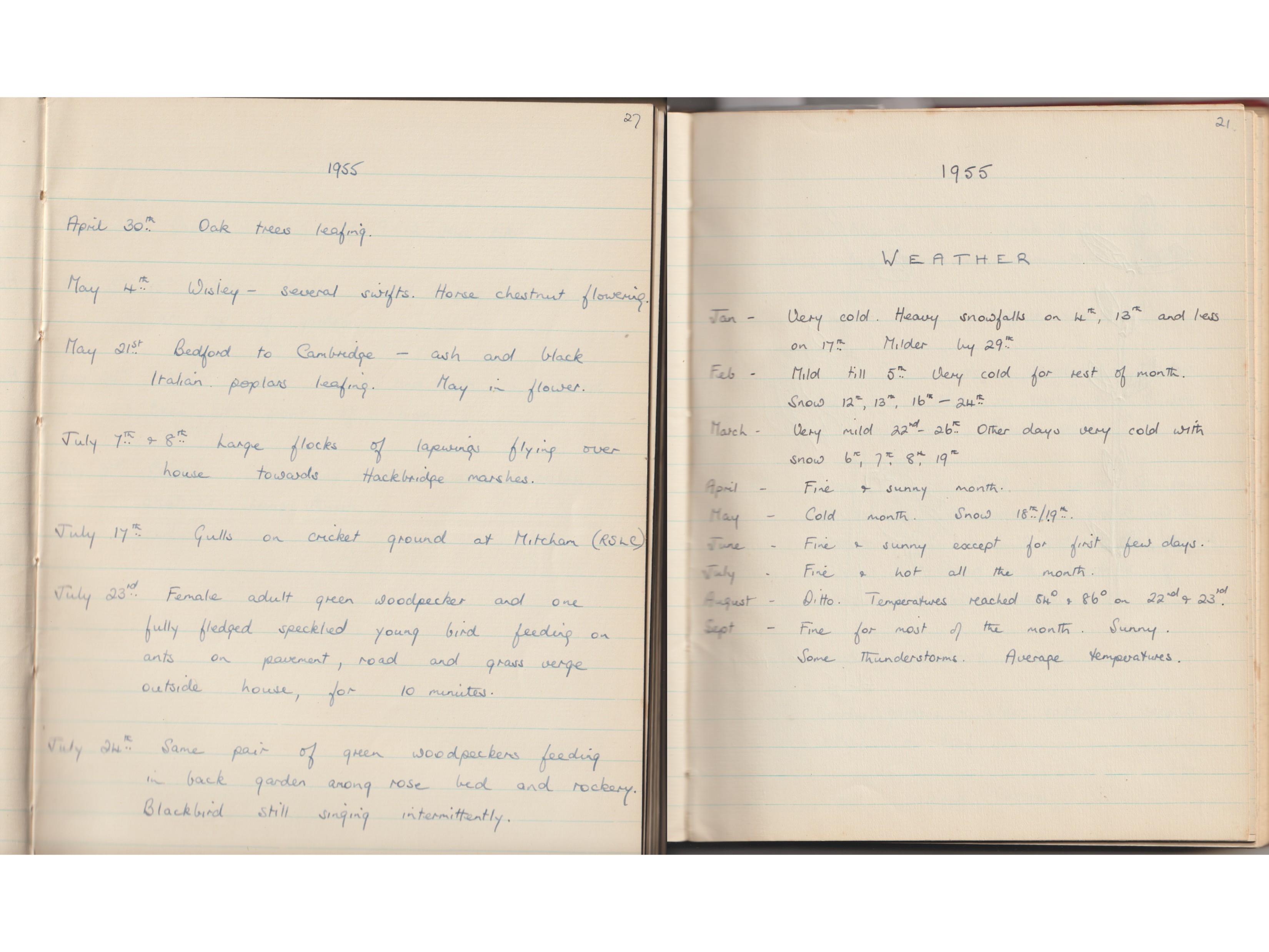 Here are pages from Jean Combes’ phenology diary from the year 1955.