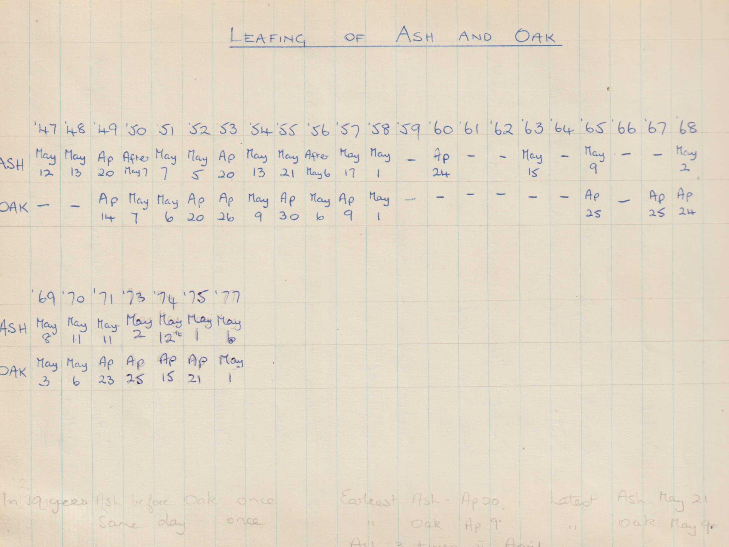 Oak and Ash leafing dates from 1947 to 1977.