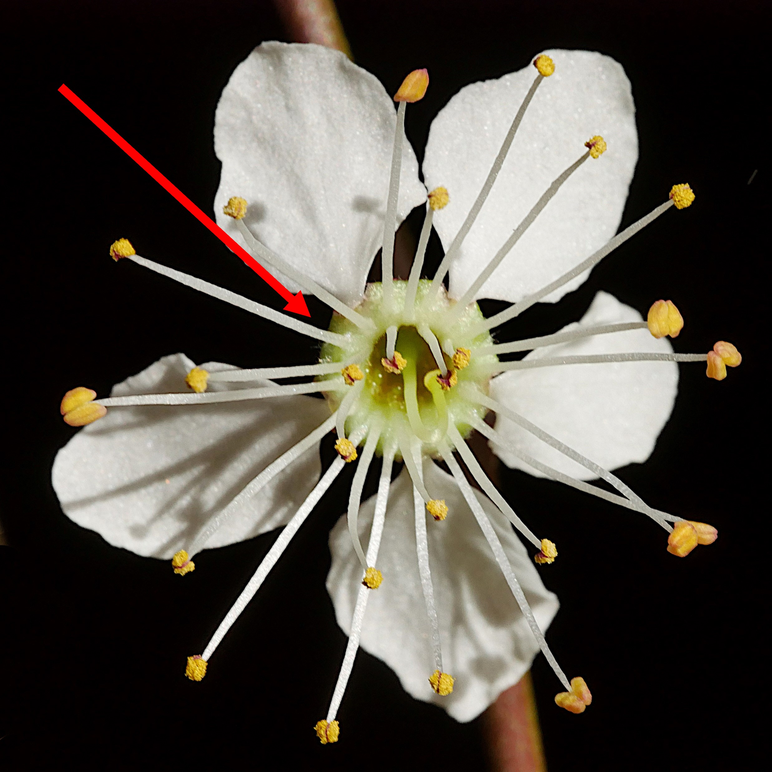 Cherry plum (Prunus cerasifera). The sepals of cherry plum flowers are reflexed (i.e bent backwards, see red arrow), whereas the sepals of blackthorn flowers are not reflexed (see above image). Cherry plum flowers a few weeks earlier than blackthorn. Image credit: Helge Klaus Rieder