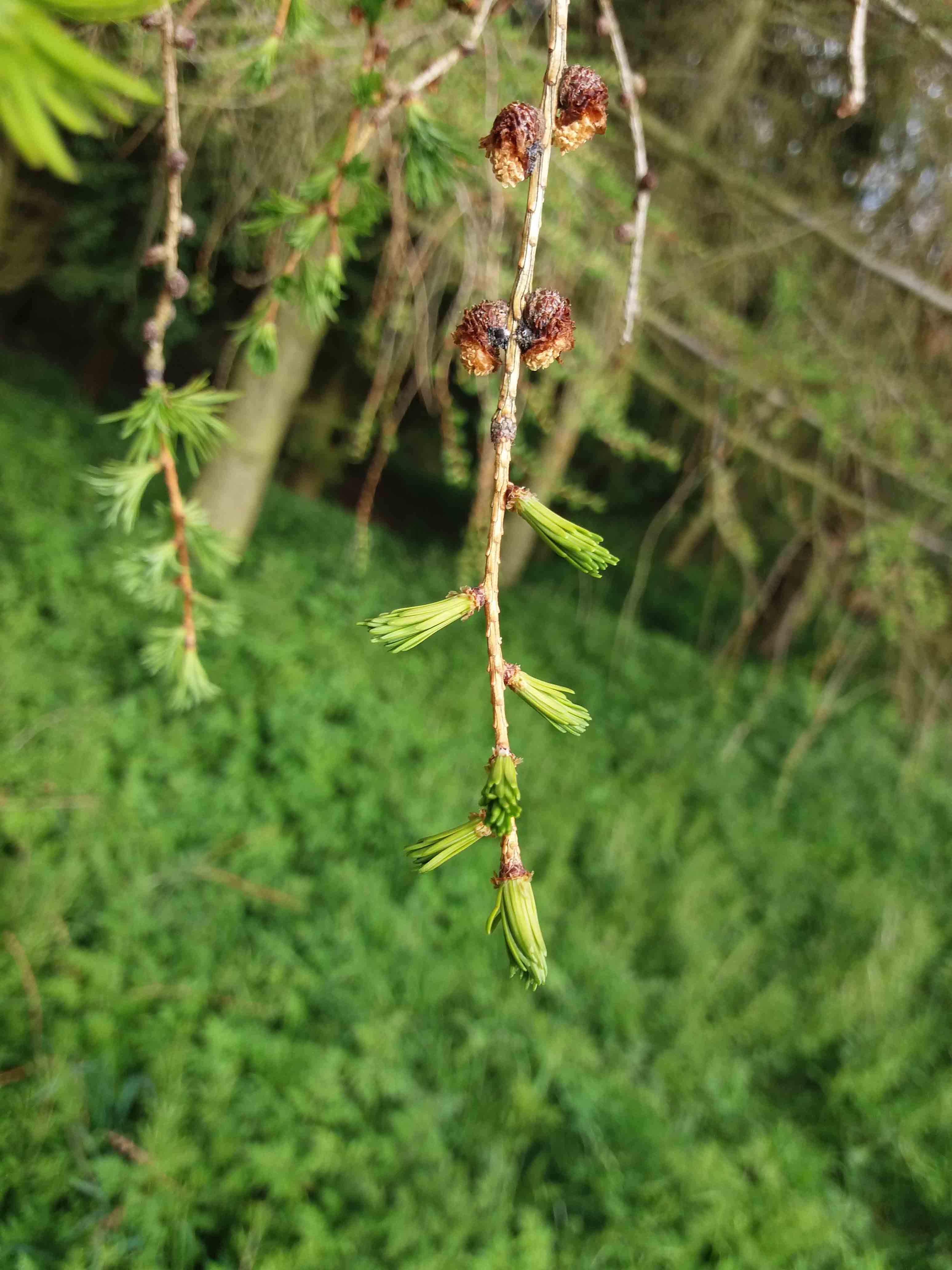 Record European larch budburst when the green tuft of needles is just visible, but the needles have not yet separated.